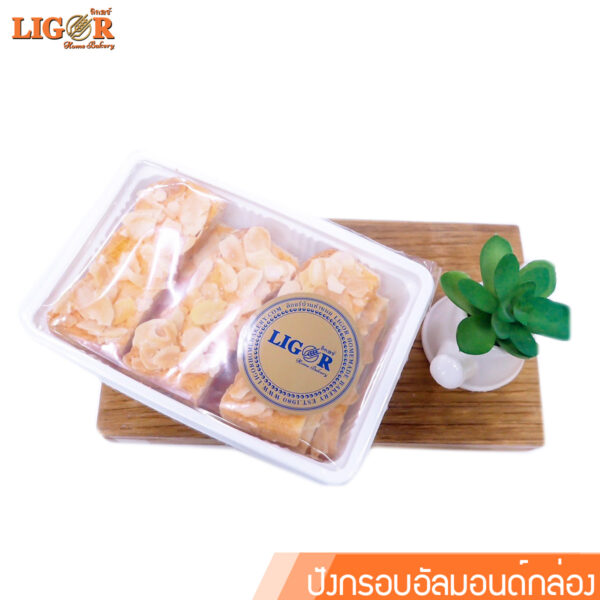 ขนมปังทาเนยหวานหอมละมุน แล้วโรยด้วยอัลมอนด์สไลซ์แน่นๆ นำไปอบจนกรอบ หอมกรุ่นทุกแผ่น เคี้ยวเพลินได้กลิ่นหอมเนยผสมความมันของอัลมอนด์อย่างลงตัว เหมาะสำหรับซื้อเป็นของฝาก หรือขนมทานเล่นประจำบ้าน